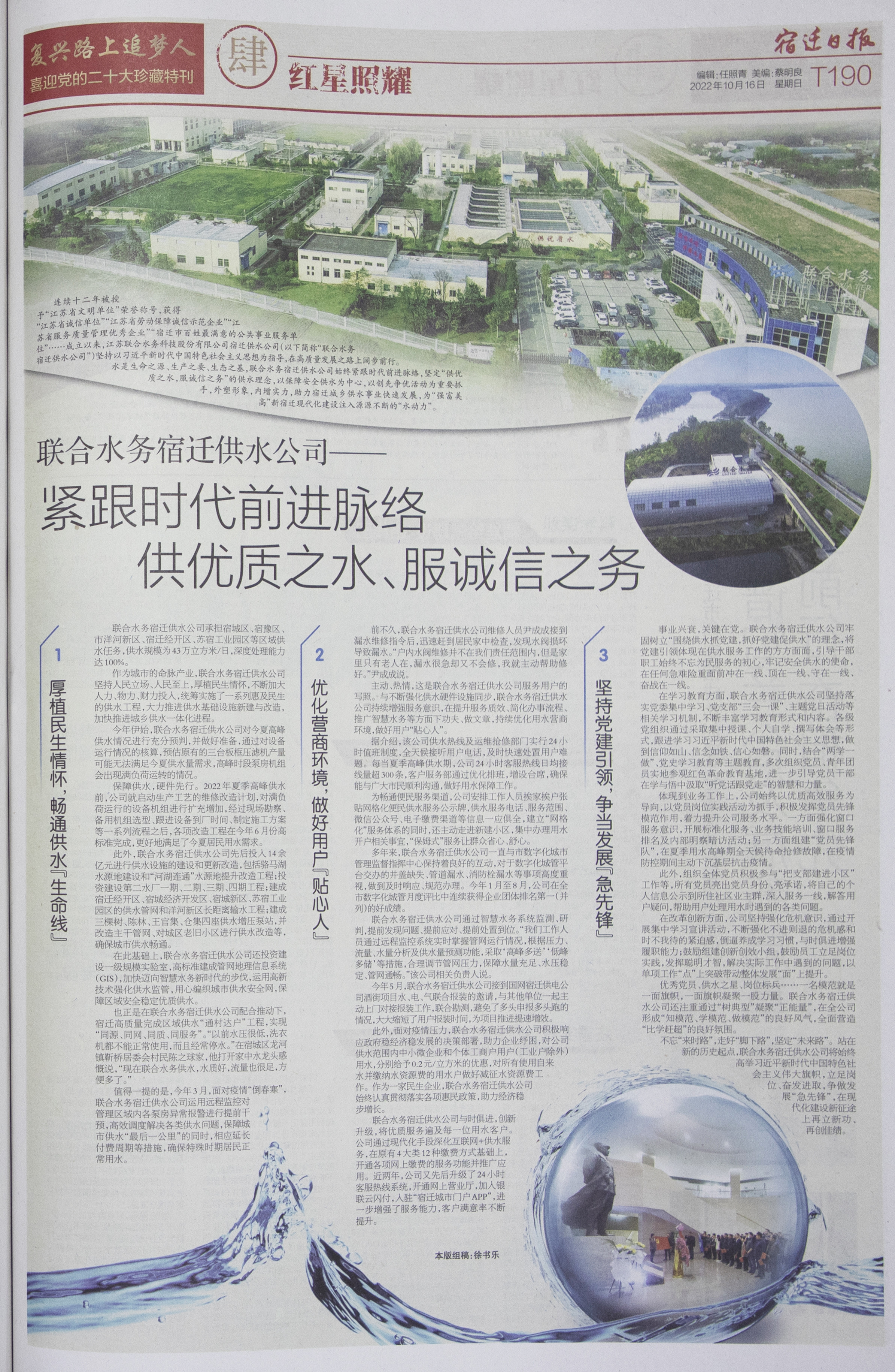 致敬崢嶸歲月,禮贊百年風(fēng)華。在黨的二十大召開(kāi)之際,江蘇聯(lián)合水務(wù)科技股份有限公司宿遷供水公司作為城市“命脈”的守護(hù)者榮登宿遷日?qǐng)?bào)社《復(fù)興路上追夢(mèng)人——喜迎黨的二十大珍藏特刊》,特刊從攻堅(jiān)、改造、提質(zhì)、創(chuàng)優(yōu)、黨建等方面全景式盤(pán)點(diǎn)了聯(lián)合水務(wù)宿遷供水公司十八載砥礪奮進(jìn)歷程,大篇幅展示在新時(shí)代昂揚(yáng)奮進(jìn)的洪流中,水務(wù)企業(yè)提速攻堅(jiān)興水務(wù)、緊跟時(shí)代提服務(wù)的高質(zhì)量發(fā)展之路。