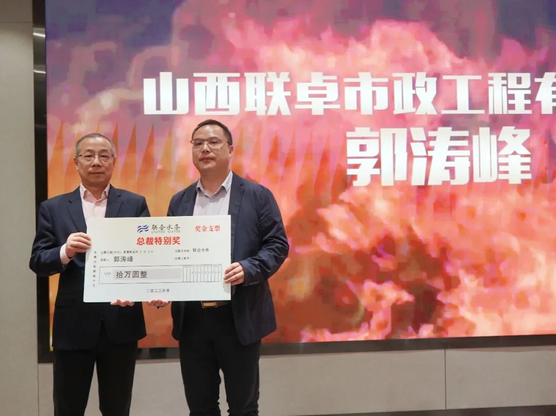 俞總作總結(jié)發(fā)言 會上,俞總向大家分析了當(dāng)前國內(nèi)外經(jīng)濟形勢,分析了行業(yè)趨勢,提出在新的一年,聯(lián)合水務(wù)將開啟新的發(fā)展征程。2023年,我們將面臨新的環(huán)境要求,我們要充分發(fā)揮新的平臺優(yōu)勢,緊緊圍繞“主業(yè)清晰、業(yè)績增長、運營高效”的企業(yè)價值目標(biāo),勵精圖治,高質(zhì)量提升存量業(yè)務(wù),切實完成業(yè)績目標(biāo),不斷提升管理效率,運營好現(xiàn)有傳統(tǒng)水務(wù)業(yè)務(wù)。同時,要奮發(fā)有為,高質(zhì)量發(fā)展增量業(yè)務(wù),開發(fā)優(yōu)質(zhì)項目和戰(zhàn)略業(yè)務(wù)。我們要聚焦主業(yè),強化科技支撐,輕重業(yè)務(wù)結(jié)合,國內(nèi)與海外發(fā)展;我們也將研究并審慎評估“水務(wù)+”新興領(lǐng)域,充實業(yè)務(wù)版塊,增強管理團隊。 最后,俞總強調(diào),我們要堅持“團結(jié)、誠信、拼搏、共贏”的企業(yè)精神,在2023年的工作中勵精圖治,奮發(fā)有為,為開啟聯(lián)合水務(wù)發(fā)展新征程、實現(xiàn)聯(lián)合水務(wù)高質(zhì)量發(fā)展而努力奮斗。 會議為建設(shè)管理中心副總經(jīng)理兼任山西聯(lián)卓市政工程有限公司總經(jīng)理郭濤峰頒發(fā)了“2022年度總裁特別獎”。2022年,郭總兢兢業(yè)業(yè)、勤懇奉獻(xiàn),率領(lǐng)聯(lián)卓公司建設(shè)團隊出色完成了業(yè)績?nèi)蝿?wù),為提升聯(lián)合水務(wù)經(jīng)營業(yè)績和項目建設(shè)做出了貢獻(xiàn)。