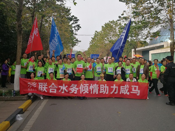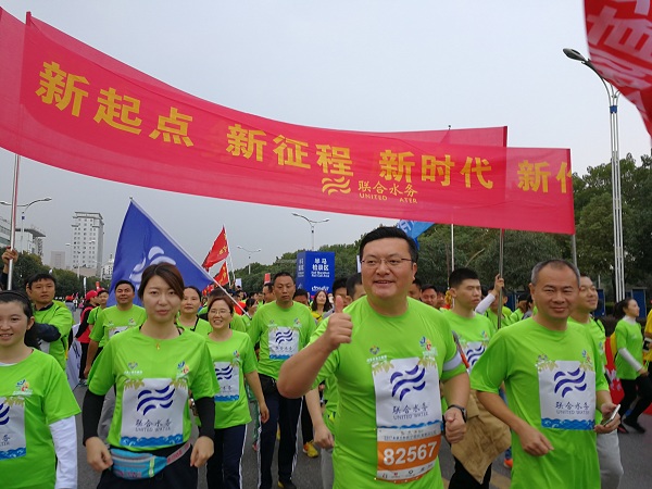 11月11日上午8點(diǎn),2017年咸寧國際溫泉馬拉松賽在咸寧市人民廣場鳴槍開跑,本次活動吸引了全世界的1.2萬人參加,聯(lián)合水務(wù)集團(tuán)副總裁劉猛、陳樵、James Beeson先生及旗下6個項(xiàng)目公司的63名參賽隊員匯集香城泉都,代表聯(lián)合水務(wù)傾情助力本次馬拉松大賽。 當(dāng)天7:20,集團(tuán)63名參賽人員和咸寧公司70名啦啦隊和服務(wù)人員,在起點(diǎn)人民廣場集中,高舉“新起點(diǎn)、新征程、新時代、新作為”、“聯(lián)合水務(wù),服務(wù)咸寧”的橫幅,大家步伐整齊,揮舞彩旗,方陣格外引人注目,為本屆馬拉松賽事增添了一抹亮麗的風(fēng)景。