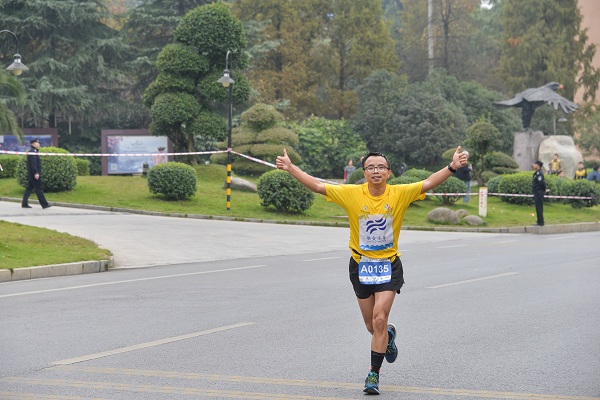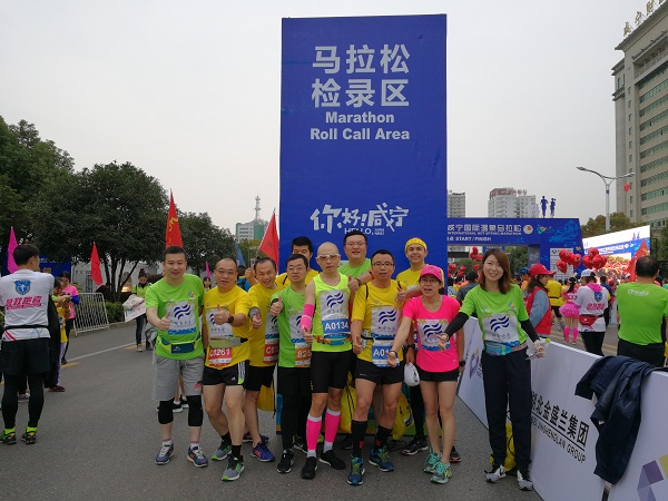 (圖3:微型馬拉松隊員合影) 集團(tuán)副總裁劉猛先生帶領(lǐng)集團(tuán)46名微型馬拉松隊員,甩開膀子、大步向前沖刺,賽道上大家不甘落后,互相鼓勵,以堅韌不拔、永不言棄的精神,超越自我極限,跑向終點(diǎn),咸寧聯(lián)合水務(wù)羅志祥獲得了聯(lián)合水務(wù)微馬參賽人員第一名。 集團(tuán)副總裁陳樵、James Beeson先生帶領(lǐng)17名全程、半程馬拉松隊員經(jīng)過1至3個多小時的激烈角逐,全部抵達(dá)終點(diǎn)。集團(tuán)人事行政總監(jiān)楊麗霞是唯一跑全馬的女性,她以超人的毅力,鍥而不舍的精神跑完全程。新絳縣晉華生態(tài)環(huán)境工程有限公司總經(jīng)理夏學(xué)春和瑞昌市金達(dá)萊環(huán)保有限公司梅琳分別獲得聯(lián)合水務(wù)參賽人員半程和全程馬拉松第一名。集團(tuán)領(lǐng)導(dǎo)分別為微型、半程和全程馬拉松獲獎運(yùn)動員頒發(fā)了獎金。