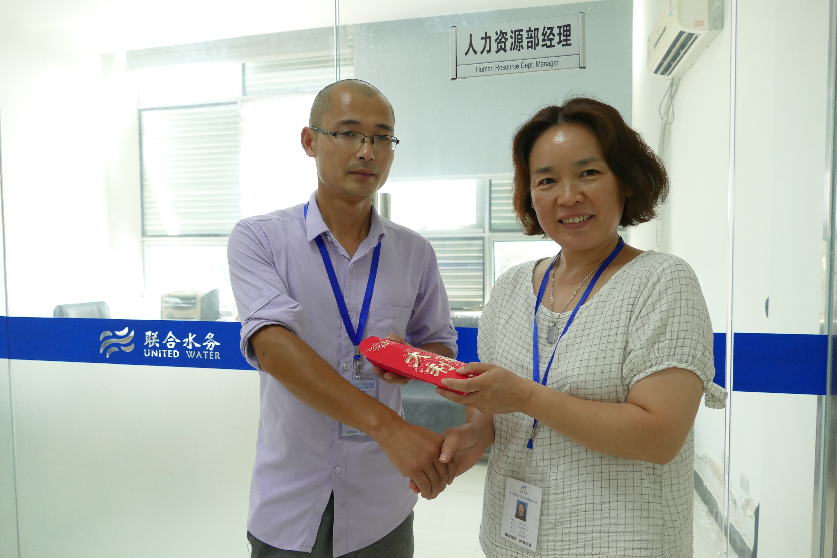 聯(lián)合水務(wù)集團(tuán)董事長兼總裁俞偉景先生得知此情況,立即做出批示:要求在宿遷公司及全集團(tuán)各兄弟公司發(fā)出捐款號召,愛心接力,并承諾聯(lián)合水務(wù)集團(tuán)兜底,捐款不足部分,由集團(tuán)公司補(bǔ)足,確保聯(lián)合水務(wù)的員工有足夠的錢為其母親支付全額醫(yī)療費(fèi)。倡議一經(jīng)發(fā)出,聯(lián)合水務(wù)集團(tuán)董事長兼總裁俞偉景先生、高級副總裁劉猛先生、陳樵先生、JamesBeeson先生,副總裁羅斌先生率先垂范捐款獻(xiàn)愛心,近千名聯(lián)合水務(wù)人積極響應(yīng), 9070元,7500元,5080元,5000元……一筆筆捐款帶著家人般無限的愛與關(guān)懷,自全國各地項(xiàng)目公司飛越千山萬水匯聚到宿遷。短短三日,全集團(tuán)共籌集愛心款73577元,超出了6萬元的募集金額一萬多元,為張用雷一家雪中送炭,為這個身陷病痛困境的家點(diǎn)燃了希望之光、撐起了一方愛的藍(lán)天。當(dāng)宿遷公司人力資源部經(jīng)理吳銘將愛心滿滿的捐款遞交給張用雷的時候,他難掩激動,雙眼濕潤。目前,張用雷的母親已在愛心款的幫助下順利完成了手術(shù),轉(zhuǎn)入康復(fù)期。為表達(dá)深深的感激之情,張用雷代表他的母親給公司寫了一篇長長的感謝信,他說,再多的文字都道不盡這份刻骨銘心的感激之情,以后他一定努力工作,報答聯(lián)合水務(wù)集團(tuán)和所有同仁們的深情厚誼。