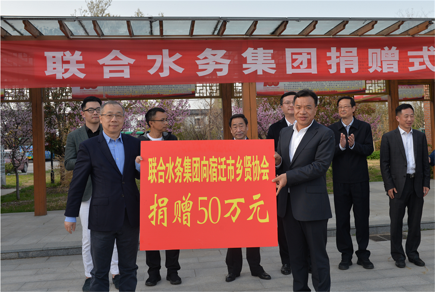 捐贈(zèng)儀式現(xiàn)場(chǎng)合影 3月28日下午,聯(lián)合水務(wù)集團(tuán)董事長(zhǎng)兼總裁俞偉景一行來(lái)宿考察鄉(xiāng)賢義務(wù)護(hù)水工作,并向市鄉(xiāng)賢協(xié)會(huì)捐贈(zèng)人民幣50萬(wàn)元為護(hù)水鄉(xiāng)賢購(gòu)買人身意外傷害保險(xiǎn)。宿遷市政協(xié)副主席、黨組副書(shū)記,市鄉(xiāng)賢協(xié)會(huì)顧問(wèn)華志明及市、區(qū)鄉(xiāng)賢協(xié)會(huì)負(fù)責(zé)人出席捐贈(zèng)儀式,共同見(jiàn)證這一神圣的時(shí)刻。